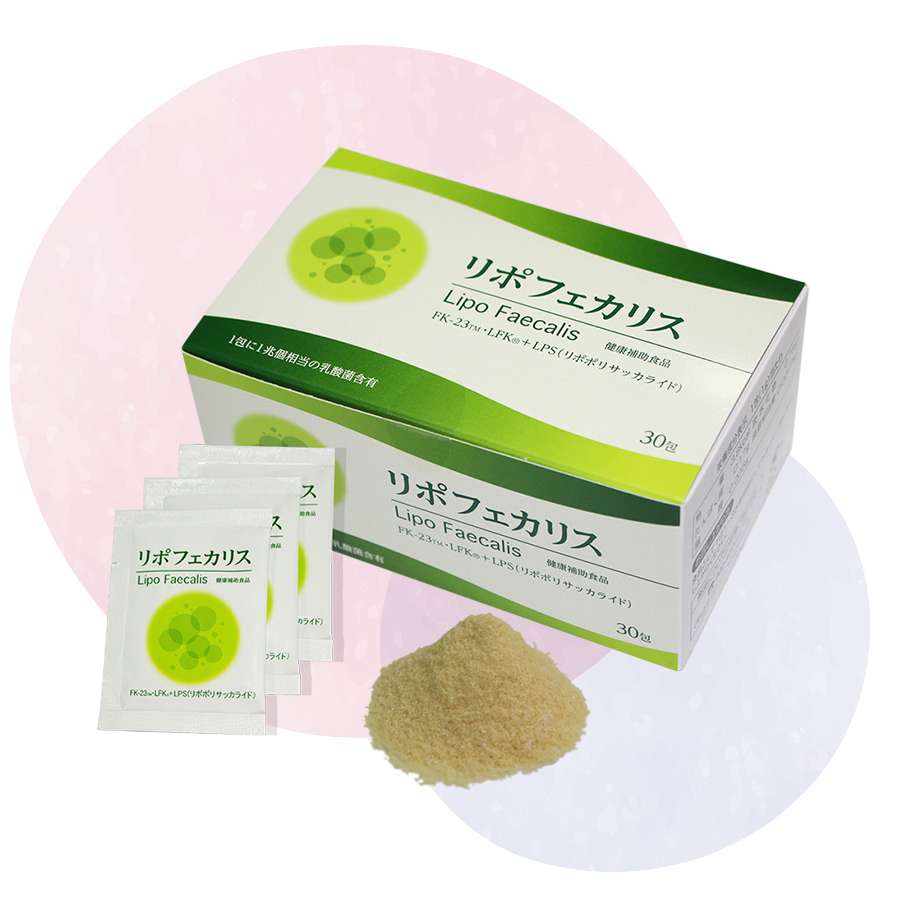 リポフェカリスには「FK-23TM」(エンテロコッカス・フェカリス)という体内細菌の中の乳酸菌の一種を使用し、健康に重要な働きをしています。
